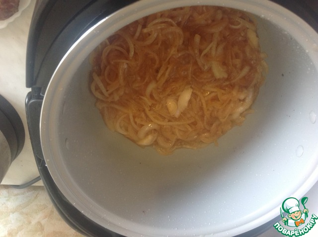 Добавляем получившуюся смесь к мясу, тщательно перемешиваем, солим, перчим и закрываем мультиварку. Режим мультиповар на 130 градусов на 10 минут. -