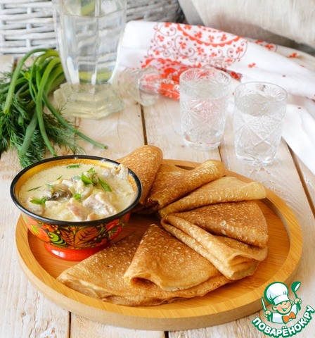 Блюдо готовится из свиных ребрышек с большим количеством подливы, чтобы макать в нее блинчики. Очень вкусно и просто!