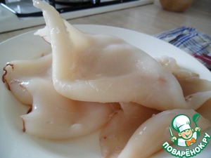 Теперь кальмары - самое страшное - это их почистить! Делать это лучше пока они еще не до конца разморозились, ну а дальше - дело техники! В подсоленную кипящую воду выложить очищенные тушки кальмаров и доведя до кипения - выключить. Накрыть крышкой и забыть про них на 10 минут. (Об этом способе я узнала в полезных советах у поваренка meforewer, совет называется "Кальмар", там, кстати, есть много чего еще интересного).