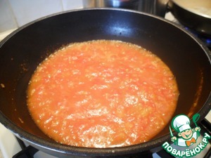 В сковородке разогреваем масло и бросаем в него 3 раздавленных зубчика чеснока, через 30 секунд отправляем туда же перетертую сливово-томатную массу, солим, добавляем щепотку сахара, и слегка упариваем. Я люблю не очень густой соус. В конце добавьте веточку базилика и отставьте в сторону.
