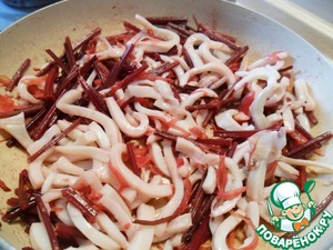Пока тушится - нарежьте соломкой кальмар и отправьте его туда же на сковороду, дайте выпариться влаге, пусть еще немного обжаряться уже все вместе.
