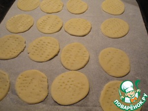 Выкладываем на противень, застеленный пергаментом. Накалываем вилкой. И отправляем в духовку при 200 градусах на 10 минут.