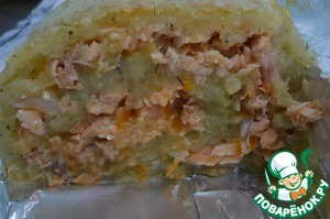 Можно приготовить и как обычную запеканку -слоями. Но в рулете картошка лучше пропитывается соками от рыбы. -