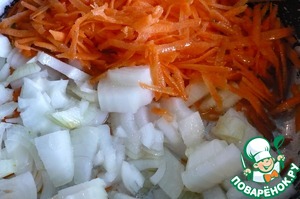 Лук шинкуем, морковь трем на крупной терке. Обжариваем на 2 ст. л масла до готовности.