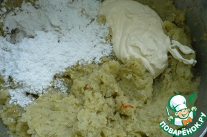 Картошку сварить, помять. Остудить. Добавить 1 ст. л. масла, крахмал, укроп и 1 ст. л. майонеза. Хорошо перемешать. Масса будет похожа немного на тесто.