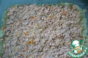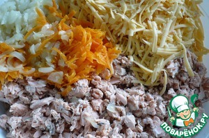 Рыбу отварить, остудить и размять руками на небольшие кусочки. Одновременно убирая пропущенные косточки. Добавить пережарку и тертый сыр. Все перемешать.