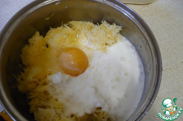Картофель натереть на самой мелкой терке - в кашицу. Я допустила ошибку при натирание и натерла картофель чуть крупнее.