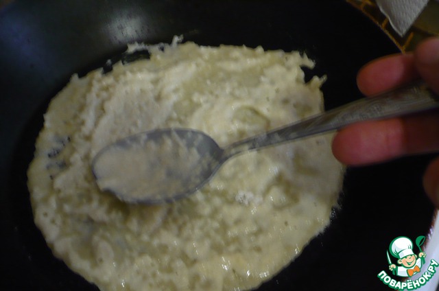 Теперь разогреть сковороду, смазать маслом. Нашу массу кладем на сковороду и ложкой очень тонко размазываем его. Чем тоньше вы размажете, тем блины будут вкуснее. И очень хорошо зажариваете с 1 стороны, переворачиваете и также с другой стороны.
