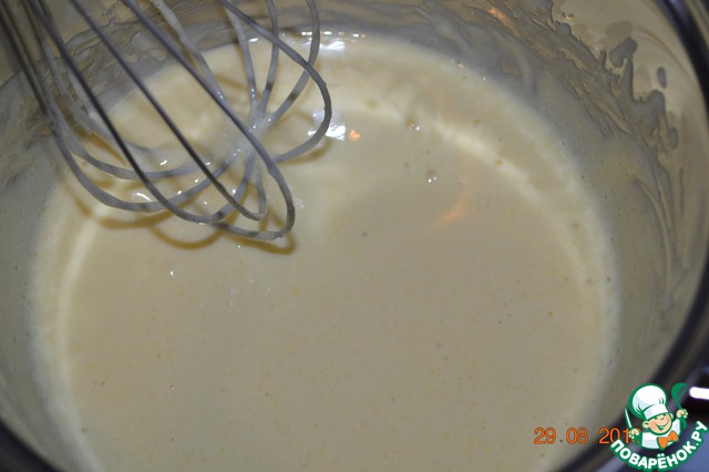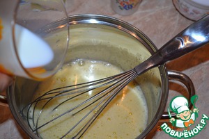 Затем влить, помешивая, тонкой струйкой горячее кипяченое молоко.