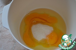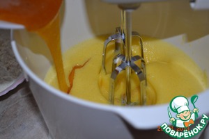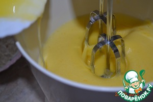 Продолжая взбивать, добавить растопленное сливочное масло.