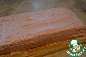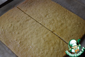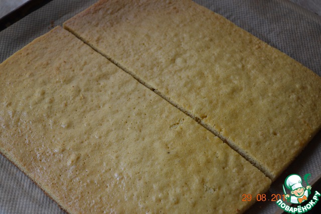 Дать коржу полностью остыть. Затем разрезаем на две части и подравниваем края. Обрезки нам еще понадобятся.