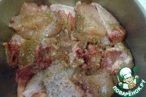 Курочку помыть и разделать на небольшие кусочки. Посыпать солью и прованскими травами. Вы можете взять любые специи, которые любите.