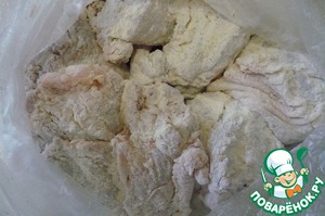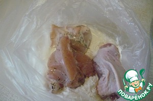После того как время прошло мы берем обыкновенный пакет. Насыпаем туда муку, присаливаем и кладем туда кусочки курицы.