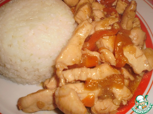 Филе нарезать полосками и обжарить до белого цвета. Далее переложить все в тарелку.