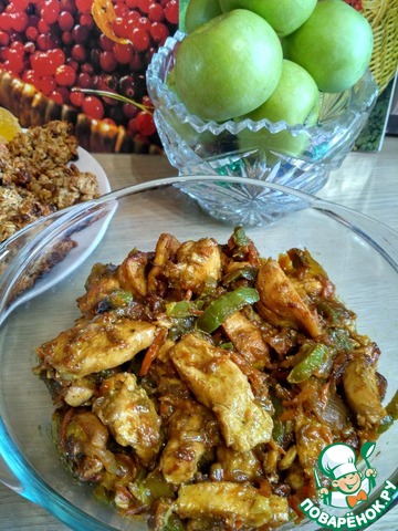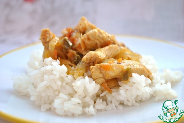 К овощам выложить курицу и соус. Можно добавить чуть-чуть воды, посолить и поперчить.