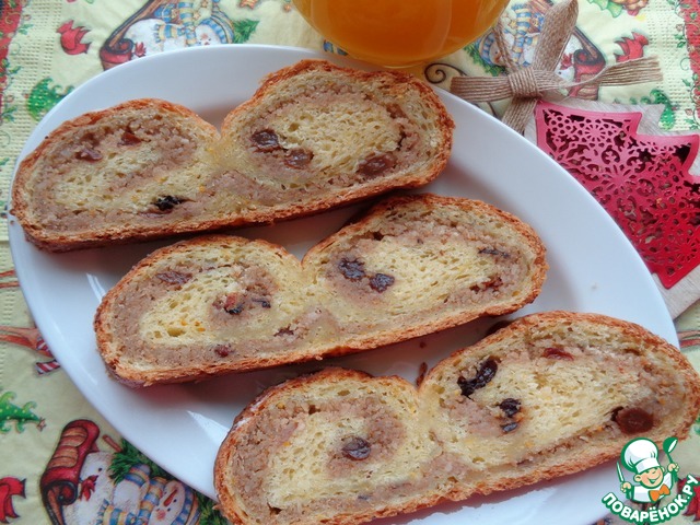 Раскатать тесто в прямоугольный пласт примерно 40 на 25 см. Разложить миндальную массу, затем – изюм. Тесто с обеих сторон закатать рулетом к середине.