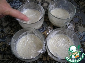 Затем нужно подготовить емкости для пудинга-в моем случае это обычные чашки. На бумажную салфетку я нанесла немного растительного масла без запаха и протерла изнутри всю поверхность чашек тончайшим слоем. Затем нужно отрезать 4 небольших куска пленки. чтобы закрыть ими поверхность готового пудинга.