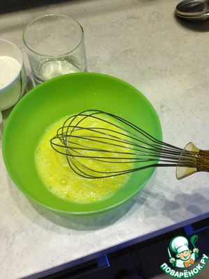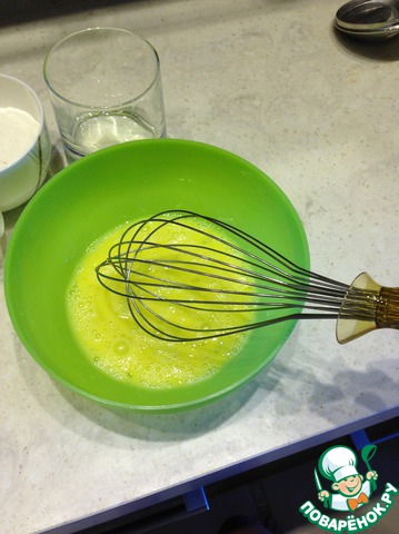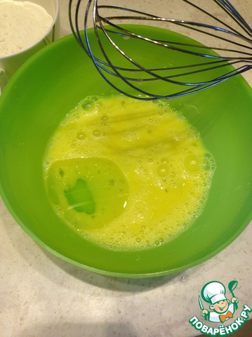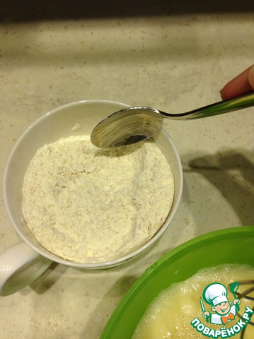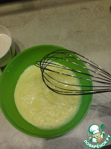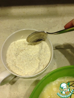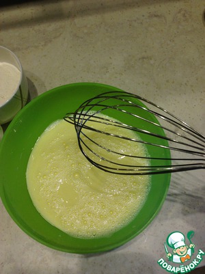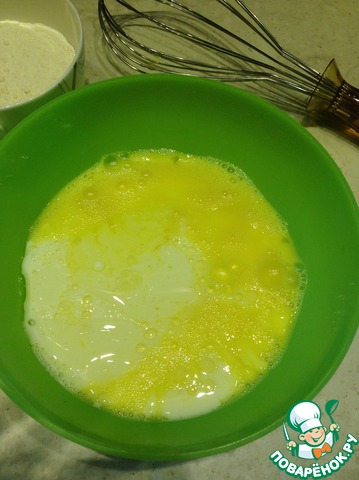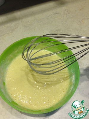 Понемногу добавляя муку, соединить смеси с помощью венчика. В тесте не должно остаться комочков.