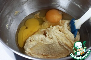 Добавить яйца и ванильную эссенцию, перемешать. Всыпать просеянную муку (150 гр) с разрыхлителем, влить 5 ст. л. воды и снова все смешать.