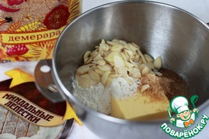 Приготовить заливку. Растопить в кастрюльке 50 гр сливочного масла, 1 ст. л. молока, 20 гр муки и 25 гр сахара, всыпать пластинки миндаля.