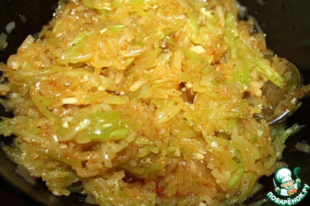Всыпать острый перец и паприку - масло зашипит и запузырится, - и сразу же вылить масло на кабачки. Перемешать. Смесь убрать в холодильник до остывания (минут 30). Но самое вкусное на следующий день, когда все промаринуется. Лишнюю жидкость перед подачей слить.