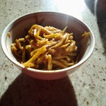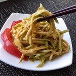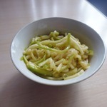 Пока вода настаивается, нашинковал кабачок длинной "корейской" соломкой. Удалил из воды трав, довел до кипения, снял с огня и в крутой кипяток пересыпал соломку. Должна постоять минут 10, пока вода остынет. После всю жидкость слить.