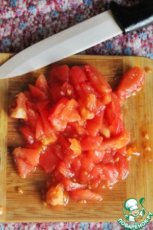 Помидоры обдать кипятком, снять шкурку и нарезать кубиками среднего размера.
