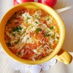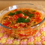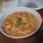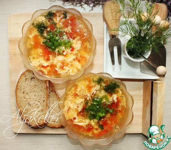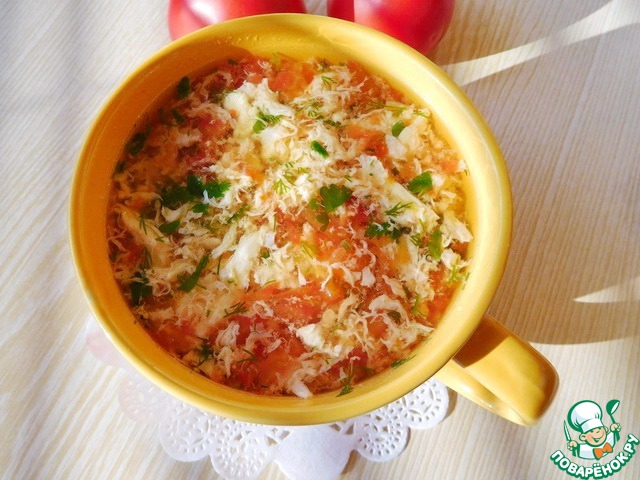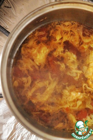 Когда помидоры закипели, ложкой расколотить суп и медленно влить яйцо, постоянно помешивая.