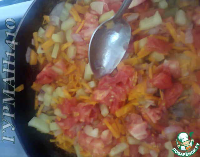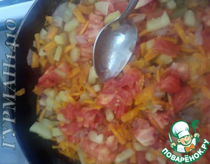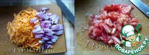Режем мелко лук, морковь, перец, помидоры (очищенные от кожуры).