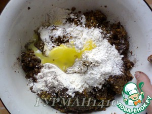 В фарш из баклажан добавляем соль, яйцо, муку, черный перец.