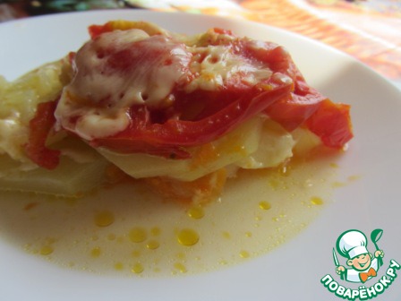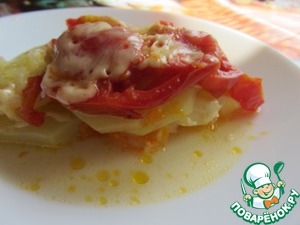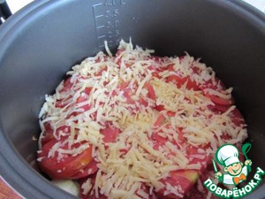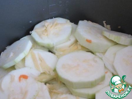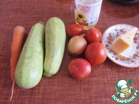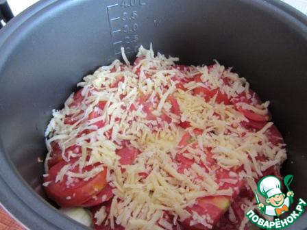На морковь сверху выкладываем кабачки, помидоры, каждый слой овощей слегка присаливаем и перчим. Посыпаем тертым сыром.