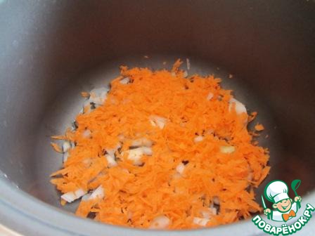 В чашу мультиварки вливаем 1-2 ст. л. растительного масла. Лук режем кубиками, морковь трем на крупной терке, распределяем лук и морковь по дну чаши.