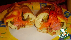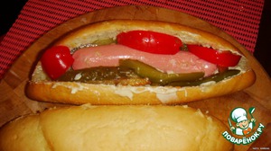 Вот что получилось в разрезе (hot dog чуть развалился, потому как его надо не резать, а кусать). Запивать сладким чаем.
