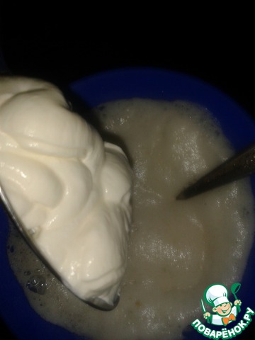 К погашенному разрыхлителю добавить 2 столовые ложки сметаны и перемешать.