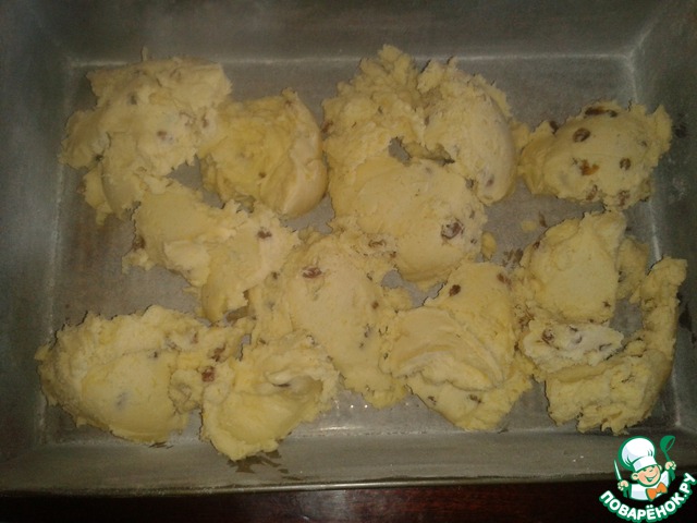 В муку с маргарином добавить сахар, соль, яйца, ванильный сахар, цедру из лимона и погашенный разрыхлитель. И в конце, если любите, то добавьте изюм (просто промойте и просушите, и не нужно изюм заливать кипятком).