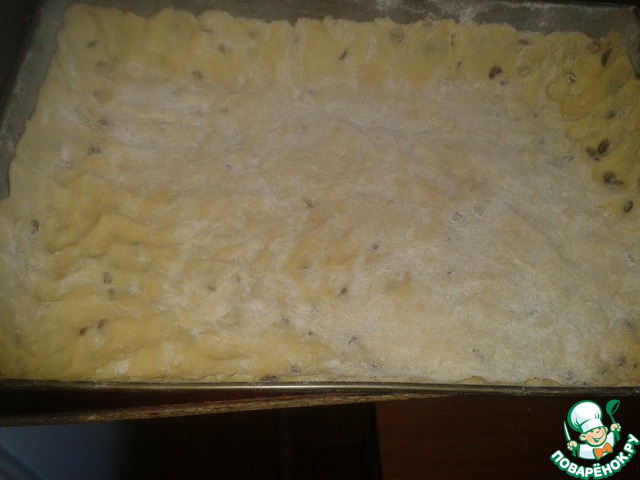 Форму смазать кулинарным жиром, посыпать мукой, можно выстелить пергаментом. Выложить тесто при помощи ложки (раскатать у вас не получится, даже не пытайтесь), посыпьте тесто мукой и руками растяните по форме). У меня форма, дно которой 32х21 см.