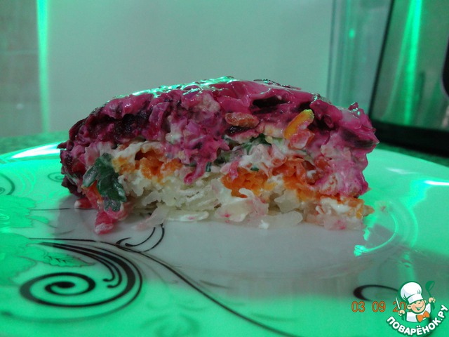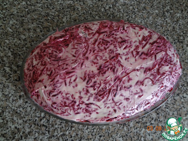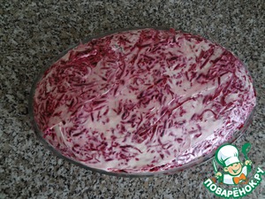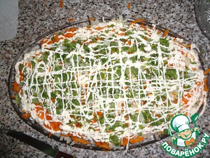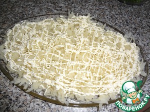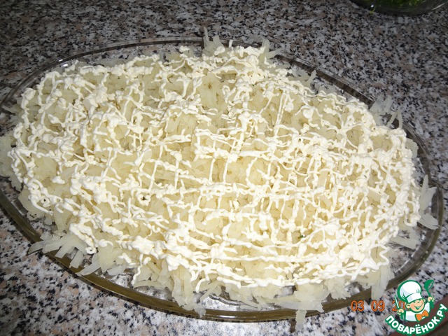 На блюдо выложить первый слой картофель через тёрку. Смазать майонезом.