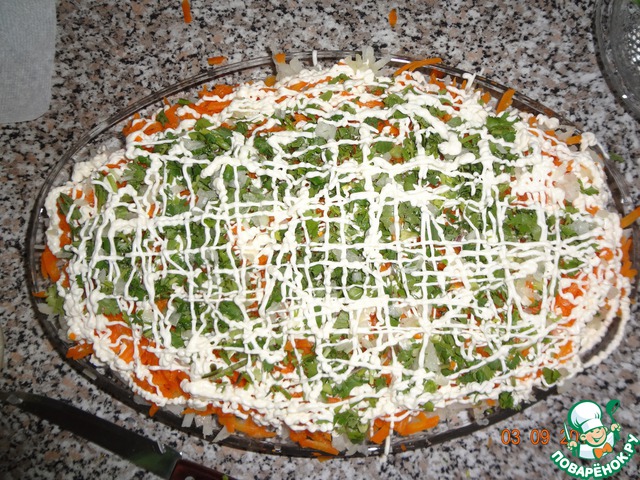 3 слой: зелень, нарезанные огурцы и репчатый лук +майонез.