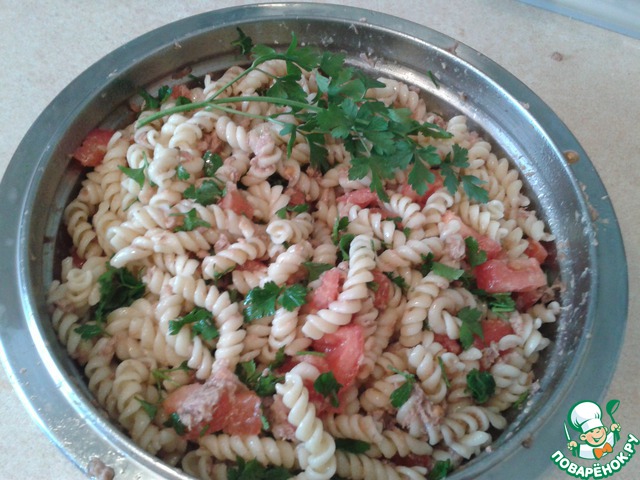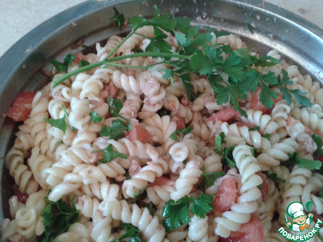 В вермишель выкладываем 2 банки тунца в масле, порезанные помидоры и петрушку, всё перемешиваем. Доправляем солью и специями по вкусу. Сразу едим, пока тёплое. Для меня блюдо вкусное именно пока оно тёплое. Холодное не очень мне нравится. Тунец должен быть именно в масле. В собственном соку мне не нравится, слишком сухое получается.