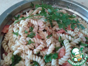 Вермишель отварить аль дэнтэ. Мне больше всего нравится в таком салате вермишель "бантики". Но на этот раз брала такую, какую нашла в шкафу. Помидоры залить кипятком на 1-2 минуты. Снять кожуру и порезать. Петрушку тоже режем.