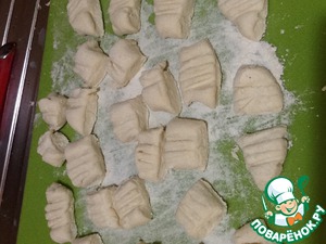 Из рикотты и муки замешиваем достаточно мягкое тесто, но так, чтобы оно хорошо держало форму. Скатываем колбаску. На присыпанной мукой рабочей поверхности нарезаем шайбочки и каждую несильно прижимаем вилкой. Вот такие ньокки-вареники у нас получаются. Отвариваем в кипящей воде буквально 2-3 минуты, воду не забываем хорошо посолить. Достаем шумовкой, пусть ждут своего часа.