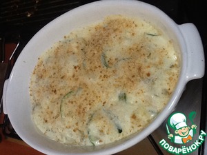 В форму для запекания укладываем вперемешку цветную капусту, вареники, кабачки, заливаем соусом так, чтобы все было надежно им прикрыто. Смешиваем пармезан и панировочные сухари, присыпаем сверху и в разогретую до 180 градусов духовку примерно на 30 мин. Получилось очень нежное блюдо.