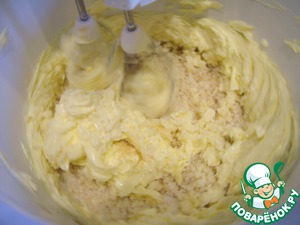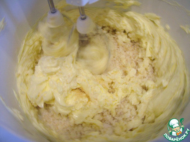 Сливочное масло взбить с 200 г. сахара (белый+коричневый) несколько минут до пышности, затем добавить яйцо и внутренность стручка ванили и взбить еще полминуты.