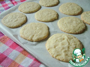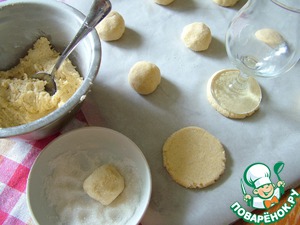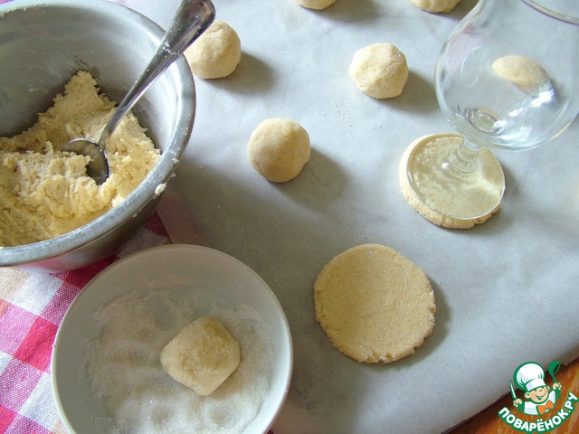 Смешать масляную и мучную смеси в однородное тесто. Немного сахара насыпать в чашку. Ложкой брать немного теста и формировать шарик диаметром примерно 4 см, обваливая его в сахаре. Выкладывать на противень, застеленный пергаментом из расчета 9 штук на один лист. Дном стакана (или чем-нибудь ровным) придавливаем наши шарики.