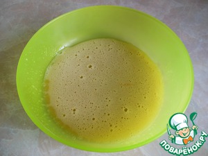 Взбить венчиком яйца и сахар. Влить кефир, размешать. Добавить ложку соды, перемешать.