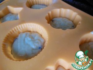 Далее слоями заливаем тесто в формочки (тесто, начинка, тесто).