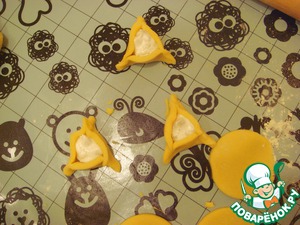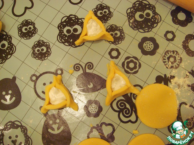 Раскатаем тесто толщиной миллиметра 3, вырежем кружочки. Положим на каждый немного белковой начинки. Сложим треугольничками.