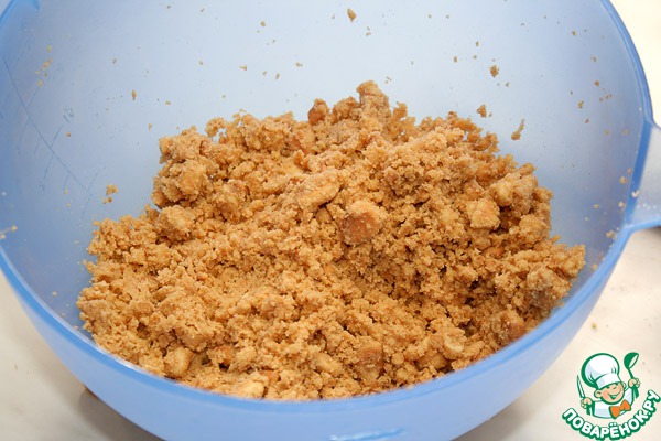 В печенье добавляем мелко порубленное и сильно охлаждённое сливочное масло и тщательно перемешиваем.
