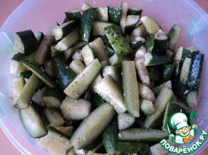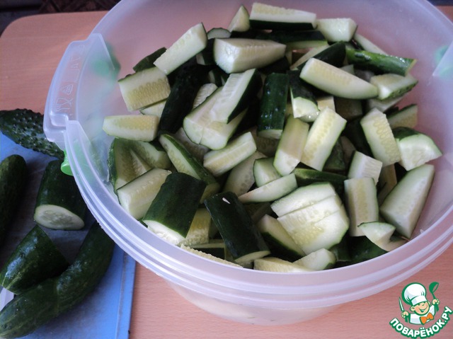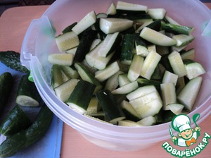 Огурцы моем, разрезаем вдоль на 4 части ( если огурцы слишком большие, то разрезаем на большее количество частей ) и затем поперёк пополам.