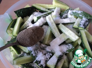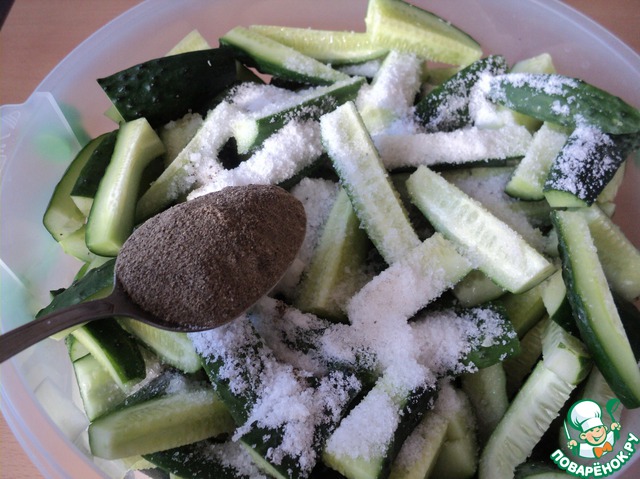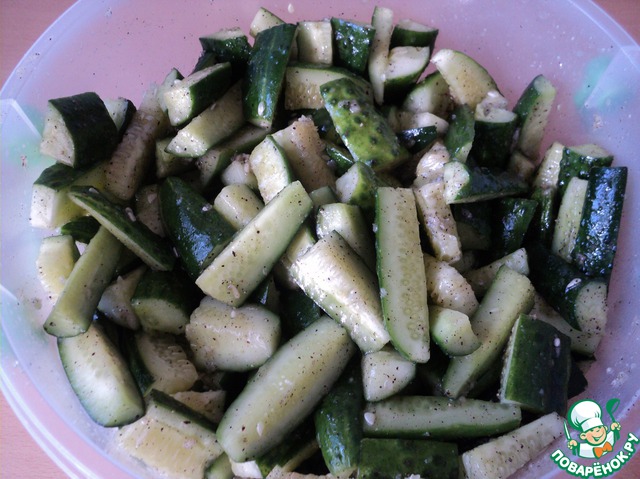 Добавляем сахар, соль, масло, чеснок, чёрный перец ( для любителей острого-можно добавить 2 ст. л.) и уксус 9%. Огурцы перемешиваем и оставляем настаиваться в течении 2-3 часов.